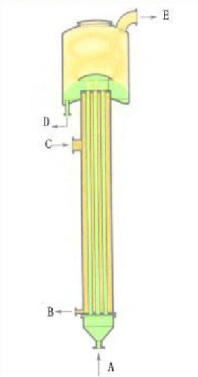 A:物料進(jìn)口B:冷凝水出口C:蒸汽進(jìn)口D:濃縮液出口E:二次蒸汽出口